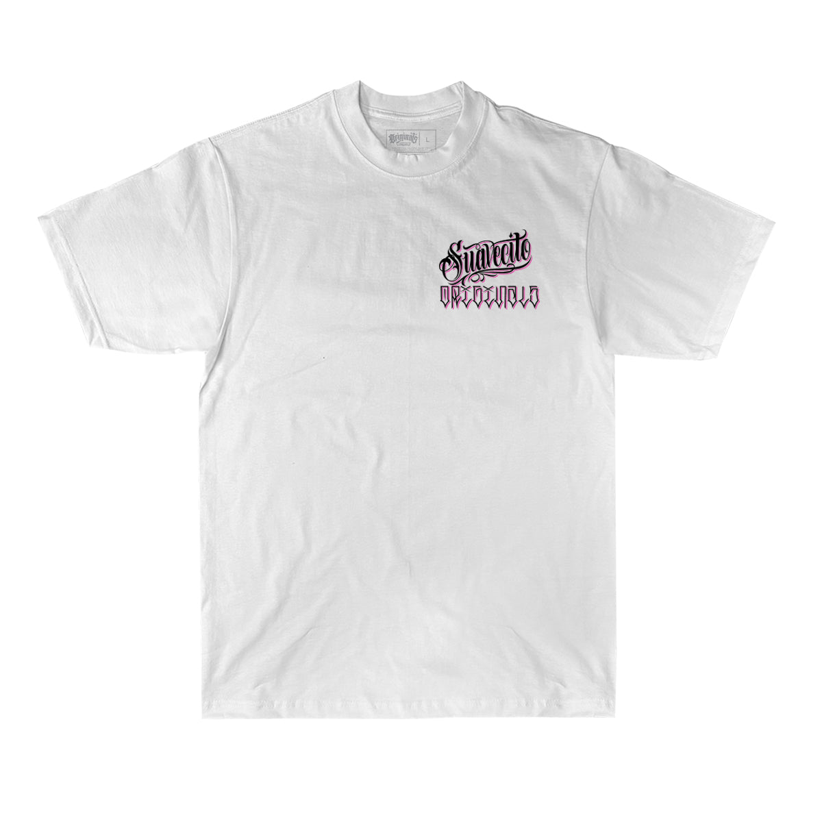 CHOLA HOLDING ROSE SCREEN PRINTED ON 7.5OZ 100% COTTON T-SHIRT.